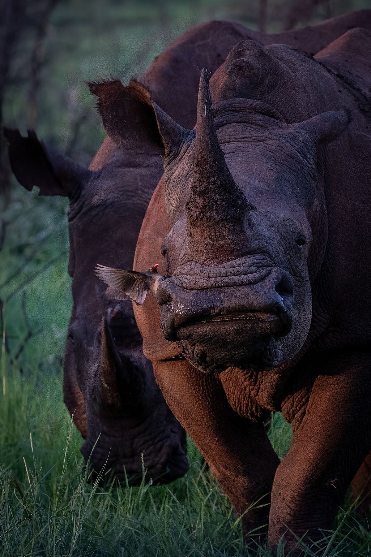 Description: There is nothing more life changing than being in the presence of rhinos. It was an early morning game drive when we came upon these rhinos. They were all covered in mud from their previous evening baths and were enjoying the sweet green grasses. This particular one though was not too pleased to have this oxpecker resting on it so early in the day, especially when trying to eat.