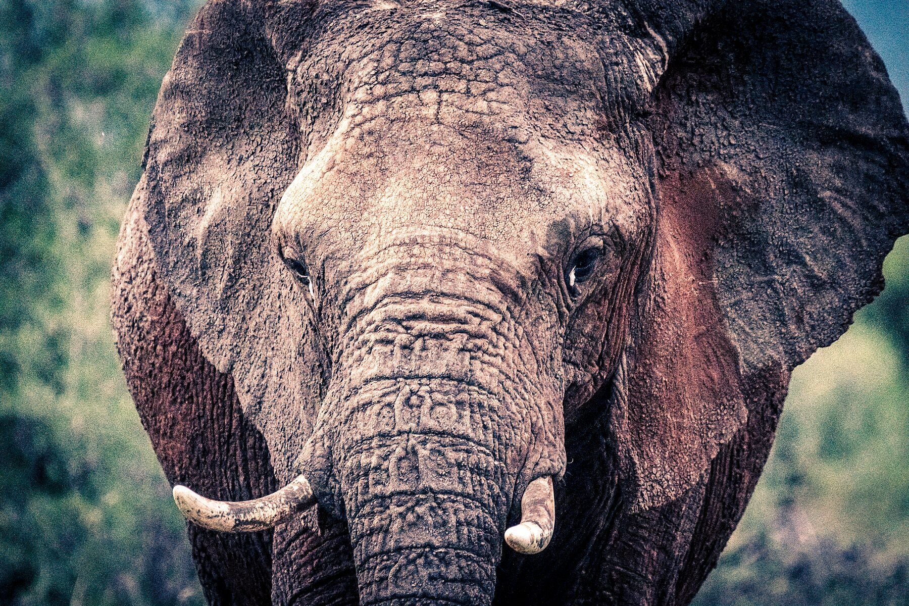 Description: A very mud clad giant elephant ambles along the road towards us. I often hold my breath when these moments happen as you never know if an elephant is going to come peacefully and walk straight past you or whether they will think you are in their way. It has been a very hot humid day and thunderstorm was building up. These elephants had been painting themselves with mud and dust earlier on in the day to keep themselves cool. They always look more wrinkled with all the extra mud.
