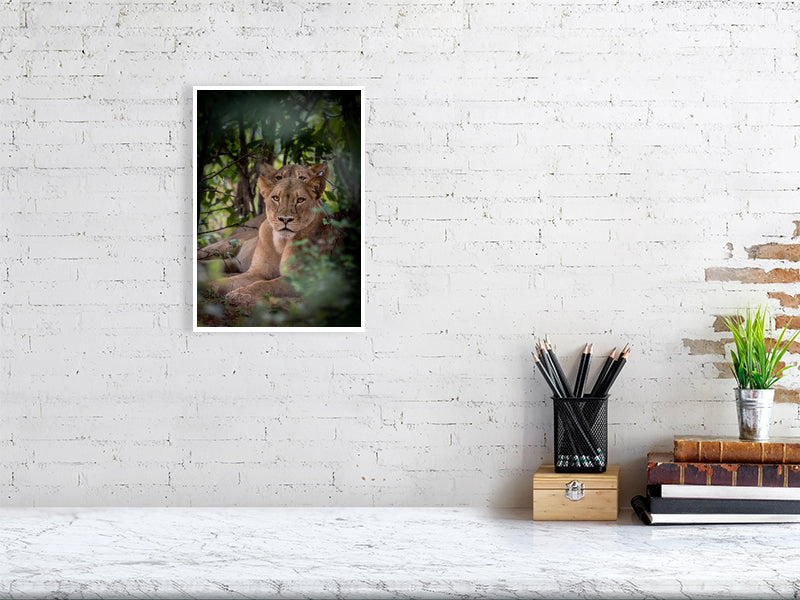 Description: On our way back to camp we spotted a lioness deep in the bushes. She was keeping a very close eye on us here. Whilst we were getting a good look at her, another head suddenly popped up directly behind her. It really created a great photographic opportunity.